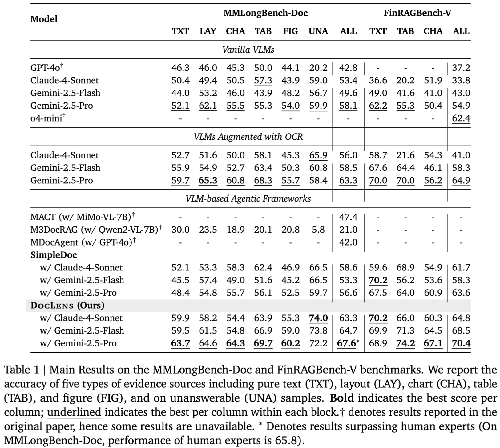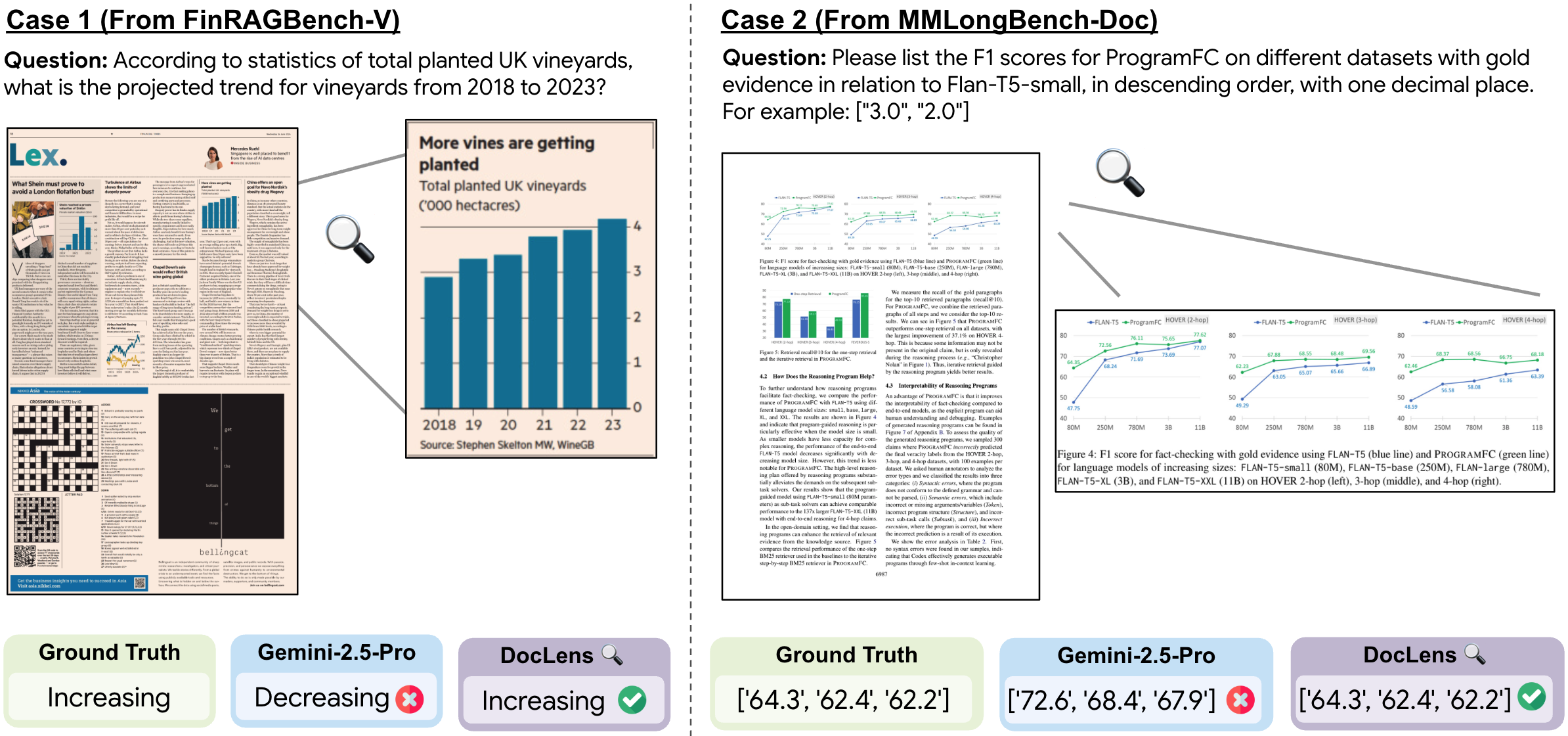 We evaluate DocLens on two challenging benchmarks: MMLongBench-Doc and FinRAGBench-V. Our method achieves substantial performance improvements across all three backbone models (Gemini-2.5-Pro, Gemini-2.5-Flash, and Claude-4-Sonnet).