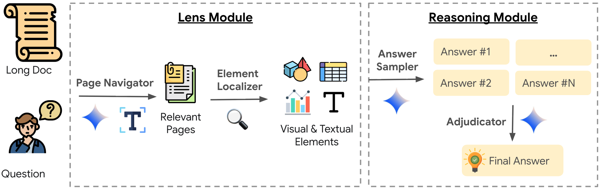 We propose DocLens, a framework consisting of two primary components: a Lens Module and a Reasoning Module. Given a long visual document and a question, the Lens Module first identifies relevant pages and the key visual & textual elements within them. Subsequently, the Reasoning Module conducts an in-depth analysis of this extracted evidence to generate a precise answer.